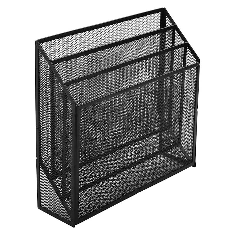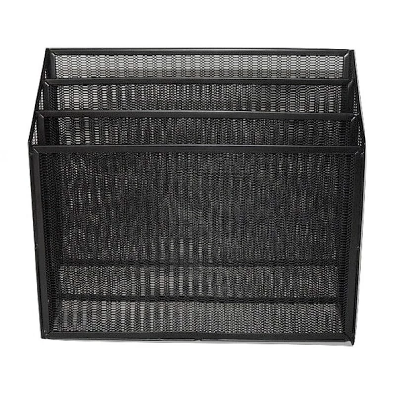 Keep important papers and documents organized and within easy reach with this tiered metal mesh file organizer. Made of black metal for strength and durability it has a modern design that will compliment almost any decor. The open slots offer three compartments for all your important work that needs to be kept at close hand.